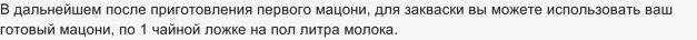 Первый раз можно готовить на купленном готовом продукте. Если в ваших магазинах не продается мацони, то готовим первый раз на свежей жирной сметане или на натуральном  йогурте, содержащего ацидофильную палочку. Конечно, это еще не мацони получится, но со временем вкус выровняется,  если мацони заквашивать  от предыдущей закваски.