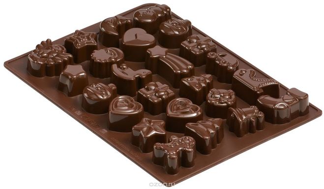 Проще просто не бывает. Вам потребуется сам шоколад (можно взять плитки шоколада, а можно купить кондитерские капельки на развес) и формочки. Формочки можно приобрести в магазине или, если есть возможность, изготовить самостоятельно. Делать формочки самостоятельно слишком накладно для многих, поэтому покупаем в магазине. Есть в кулинарных и даже детских магазинах пластиковые формы для шоколада. Мне когда-то подарили пластинку с десятком формочек среди которых были черепашка, мамонт и другие зверюшки. Такие формочки могут быть различных видов и выглядеть формочки могут вот так: