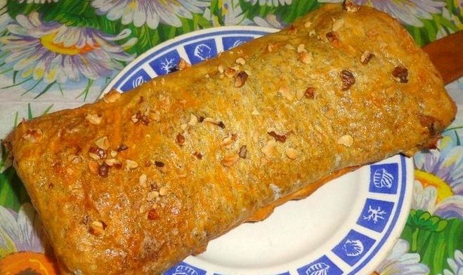 Рулет разместить в форме или на листе, сверху смазать майонезом. Выпекать до появления румяной корочки, примерно 30 - 40 минут.