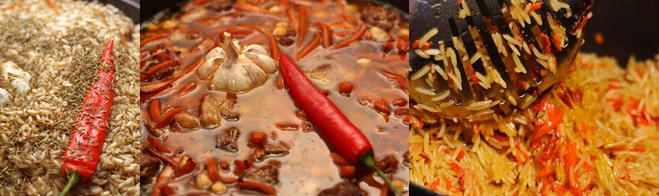 И последнее, конечно, рис укладывается в полуготовое мясо, заливается горячей водой, и после того, как рис впитает всю воду, накрывать крышкой и держать до готовности на малом огне ок. 20 минут.