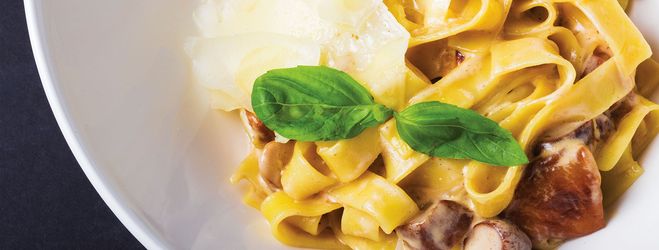 Какой рецепт у "Феттучини" с белыми грибами в сливочном соусе?
