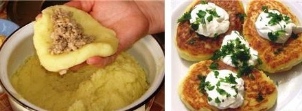 Отдельно до готовности сварить картофель и фарш. Проваренный картофель хорошо размять и в тёплые лепешки начинить фаршем с обжаренным луком. Остаётся зразам придать форму котлет и обжарить на растительном масле и тёплыми подать к семейному столу с майонезом или кетчупом.