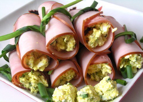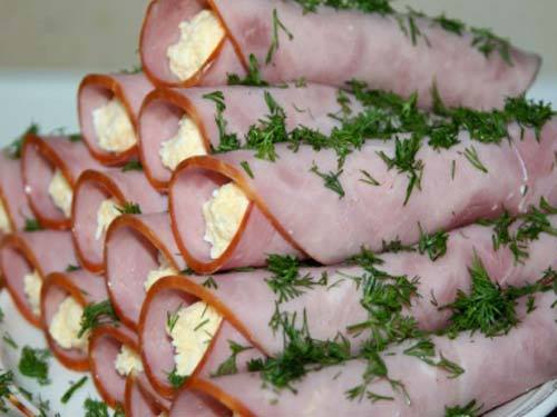 Мой личный опыт показывает, что в рулетик из ветчины можно завернуть любой овощной или мясной готовый салат, то есть все, кроме рыбы и селедки. Например салат "Оливье", греческий салат или салат "Морковь по-корейски".