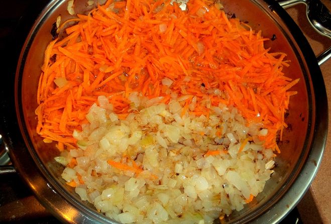 Их нужно помыть и очистить от шкурки, измельчить и обжарить (пассеровать) на масле, до мягкости и золотистого цвета.