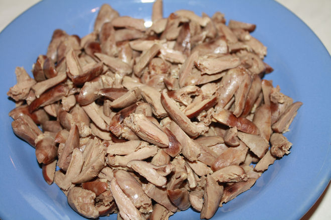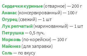 Куриные сердечки помыть и очистить от жира, выложить их в кастрюлю, добавить разрезанную на четверо луковицу,лавровый листик, соль, перец, залить водой и варить до готовности. Когда сердца будут готовы остудить и нарезать соломкой так же нарезать сыр и яйца. Зелень мелко нарубить, кукурузу промыть.