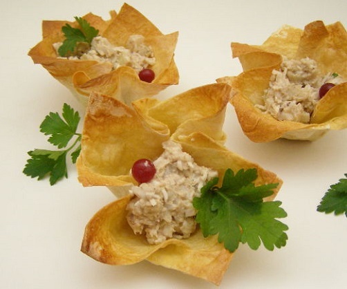 Праздничный стол всегда украшают тарталетки, это небольшие корзиночки, которые удобно наполнить салатом, паштетом и т.д.