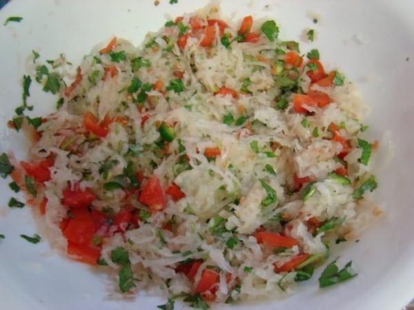 Вот так и называется этот салат, в состав которого входят: дайкон - 200 грамм, лук репчатый - 1 головка, перо зелёного лука - небольшой пучок, пучок петрушки, половина баночки стандартной консервированной кукурузы, 1 большой помидор, корень хрена на 4-5 чайных ложечки, соль и перец горький молотый по вкусу, оливковое масло 3-4 ст.л.