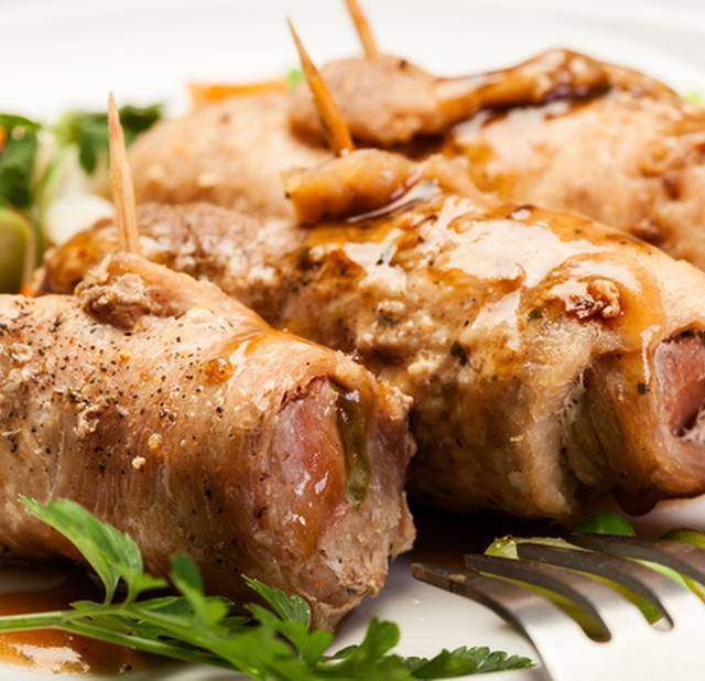 На каждый кусок телятины выкладываем кусочки копчёной свинины и сворачиваем мясо в виде рулетика. Закрепляем их нитками или зубочистками.