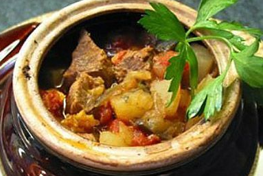 Обжаренные продукты можно складывать в казан или керамические горшочки. Самым последним обжарить лук, затем добавить сметану, соль и подлить воду. Соус прокипятить и вылить его к картошке с мясом. Добавить лавровые листочки, чеснок порезанный и кусочки сливочного масла. Казан или горшочки накрыть крышками, можно фольгой и отправить в духовку томиться на медленном огне примерно 1 час.