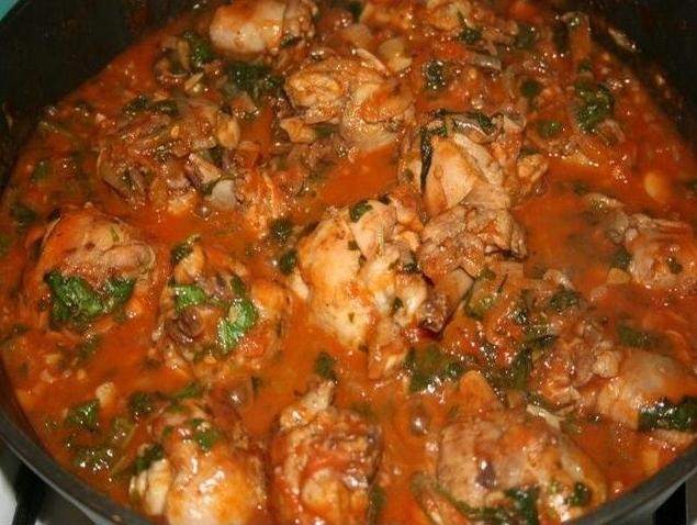 Добавить по вкусу специи, посолить и накрыть крышкой. На слабом огне готовить около 30 минут. Если курица жилистая, то готовится она может час и дольше. Чеснок выдавить в самом конце приготовления, готовое блюдо посыпать зеленью. На гарнир сварить картошку или рис.