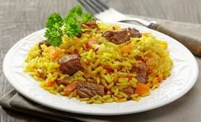 - ингредиенты: свинина 300-350 грамм, сушеные морковь с луком и масло растительное (тут все зависит от площади емкости и ваших вкусовых предпочтений), рис - стакан, вода - два стакана, куркума - 2/5 ложки (чайной) + четверть ложки (чайной) соли поваренной, 3 столовые ложки свежей (нашинкованной) зелени;