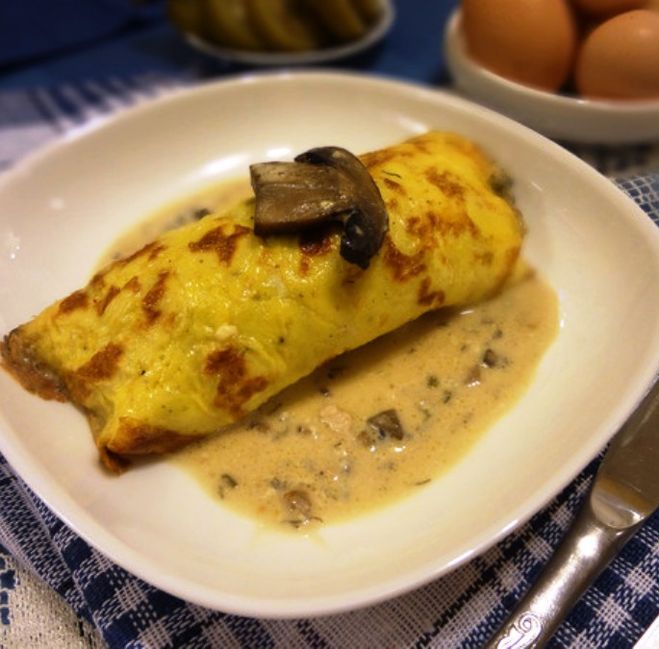 Потом выкладываем получившийся блин из яйца и фарша на большое блюдо. На него выкладываем начинку из сыра и грибов. Сворачиваем аккуратно всё в виде рулета. Получается бризоль.