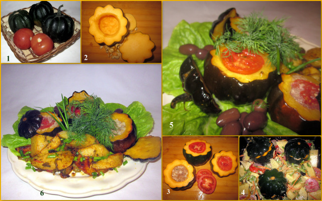 Знакомьтесь, представляю вам - цуккини, нафаршированный мясным фаршем, прикрытый срезанным кругляшком помидора, закрытый собственной шляпкой и запеченный в духовке на овощной подушке вместе с картофелем, нарезанным крупными дольками.