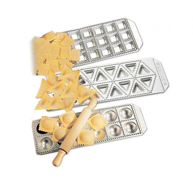 Ещё один вариант - алюминиевые формы для приготовления равиоли. Продаются они чаще всего наборами. В наборе разные пластины, под разные формы. Тут можно выбрать и квадратные и треугольные, и круглые равиоли. Так что можно будет удивлять своих домашних и гостей разнообразием не только начинок, но и форм. Кроме того, можно приготовить, например, с мясом круглые, с сыром и шпинатом треугольные, а с морепродуктами квадратные. Закинуть их в морозилку и потом не путаться, а различать вкусы по форме равиоли.