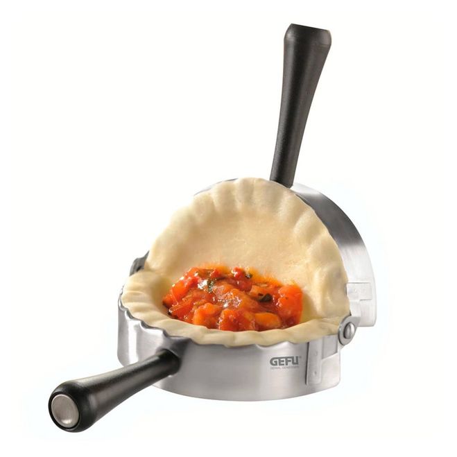 Это уже именно форма, но расчитала она на приготовления одной штучки за раз. Также раскатываете тесто, вырезаете кружочек по краям формы, укладываете этот кружочек теста в форму, закладываете в него начинку и прижимаете сверху вторым краем теста. Вуа-ля, одна равиолька готова! Процесс приготовления такой формой не сильно получится ускорить, но вот слеплять равиоли получится чуть быстрее.