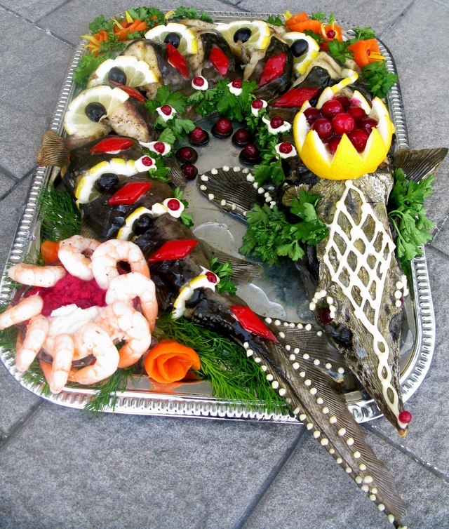 Осётр обладает вкусным мясом, в нём мало костей, нет чешуи, и запах его очень неплох. Так что, всем хороша рыбка, но подавать красиво это тоже целое искусство.