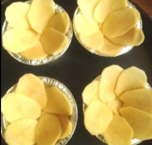Нарезаем картофель кружочками и укладываем в формочки, предварительно положив в каждую яичную смесь(немного), чтобы когда будете выпекать, картофель не распадался.