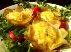 Есть очень интересный рецепт. Это блюдо понравится и взрослым, и детям. Фаршируется не целиковый картофель, а нарезанный, скрепленный яично-сырной смесью.