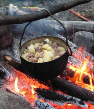 Берём котелок или сотейник, и на самое дно кладем кусочки сала, сверху вареный картофель в мундире очищенный, и на крупные куски разрезанный. Наверх на картошку еще один слой из домашней колбаски раскладываем, сверху еще картофеля слой. Нужно и луковичку порезать, бросить в котелок, а потом немного сметаны или молока добавить. Закрыть котелок и на костре прогреть его содержимое, до кипения довести.