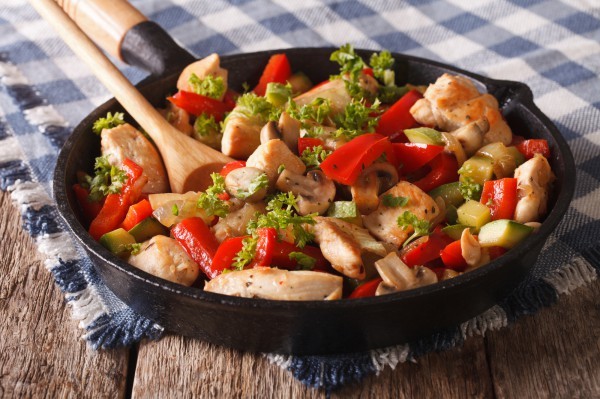 Этот соус выливаем на сковороду и выкладываем туда же курятину с овощами и грибами. Добавляем две столовых ложки масла растительного. Всё перемешиваем и тушим в течение трёх минут.