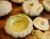 - возьмем два патиссона, вымоем их, салфетками снимем лишнюю влагу. Ножом (аккуратно) отрежем верхнюю часть и удалим всю мякоть;