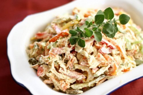 Печень сварить и потереть в салатницу. Добавить порезанный лук, яйца и натёртую морковь. Кусочками порезать картофель. Посолить и перемешать с майонезом. Такую салатную закуску можно подать к гарниру или на два три часа сытно перекусить с кусочком чёрного хлеба.