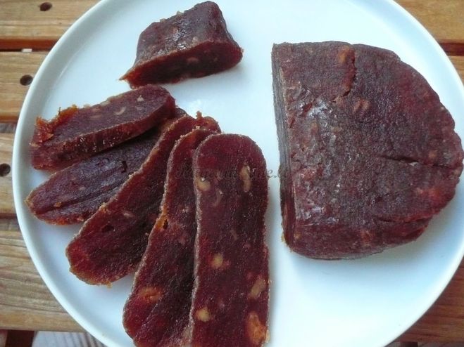 Яблоки моются,очищаются. Можно использовать опавшие, выбирать при хранении в общем любой "сорт" годится.Обрезанную мякоть помещаем в кастрюлю и варим до наибольшего выпарения воды.Масса загустеет, станет как яблочный джем. Её помещаем в плотную чистую ткань, можно специально сшить мешочек треугольником, как для клинкового сыра. В эту массу добавляется тмин по вкусу, мешочек плотно завязывается и кладется масса в мешочке под тяжелый гнет.Под гнетом сыр находится 2-3 дня. И сыр готов.