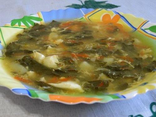 Когда картофель немного проварится, опускаем в бульон помытый, порезанный кружочками ревень. Картофель нужно класть раньше, потому что когда положится ревень, а он дает кислоту, картофель может и не свариться. Ревень варится минут 10, добавляем щавель и молодую крапиву, предварительно помыв и покрошив. Отдельно варим 2 - 3 яйца. Опускаем их в холодную воду. К этому времени куриное мясо остынет, его нужно отделить от костей, порезать на порционные куски. Солим в конце суп по вкусу. Приправ я не добавляю, этот суп состоит из ароматной зелени. Через минут 8-10 щавель и крапива будут готовы, значит суп из ревеня и молодой зелени готов. В тарелку кладем порционный кусок курятины, резанное на 6-8 частей яйцо, заливаем супом, посыпаем резаным укропом, добавляем ложку сметаны. Полезный витаминный суп " Весенний" из ревеня готов.