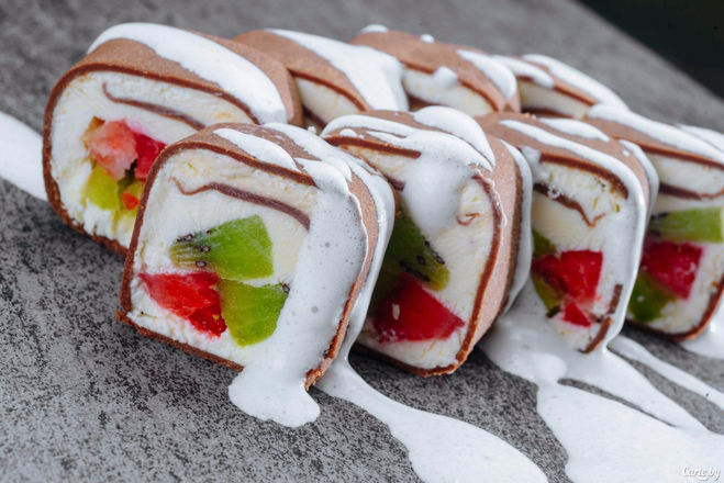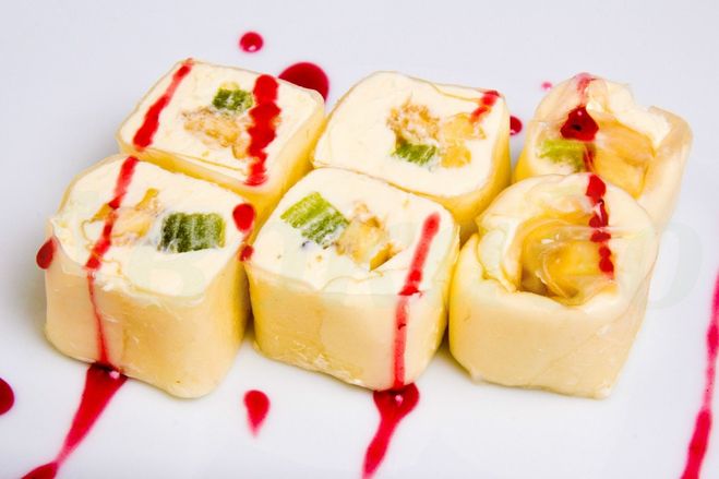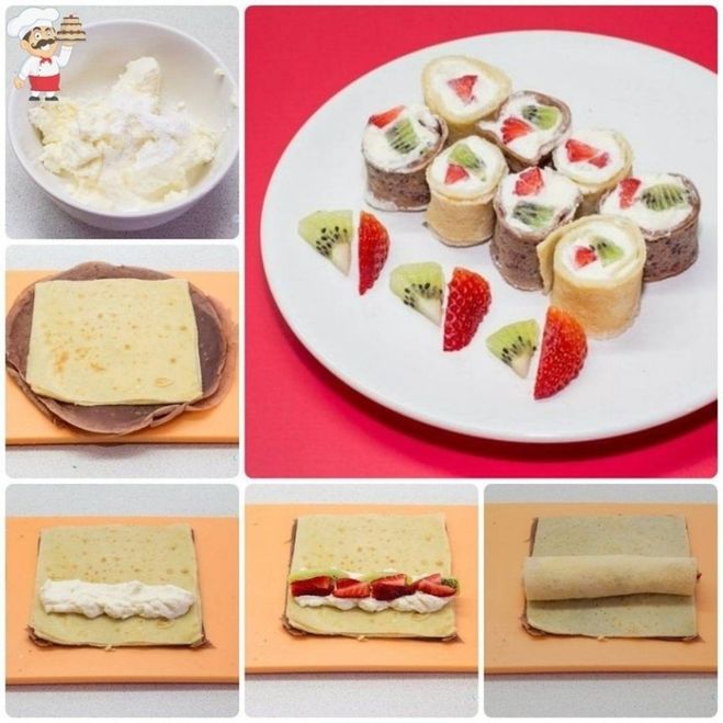 Лучше всего для приготовления сладких роллов подходят - киви, бананы, клубника, черешня. Заворачивают сладкие роллы не в нори, а в блинчик. Ну и конечно же здесь нет риса, в качестве основы служит сливочный сыр.