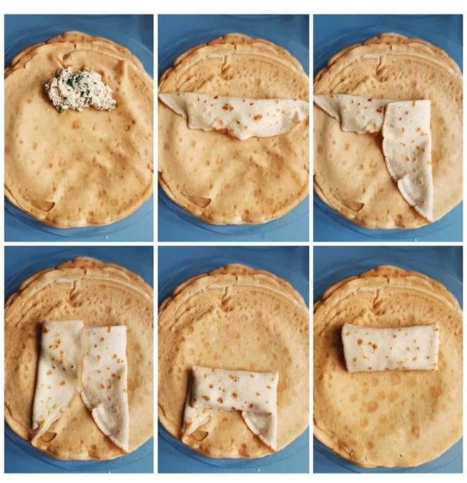 После жарки блинов готовят начинку: творог соединяют с одним куриным яйцом и вводят дополнительные ингредиенты для улучшения вкуса. Всё перемешивают, заворачивают в блины по схеме: