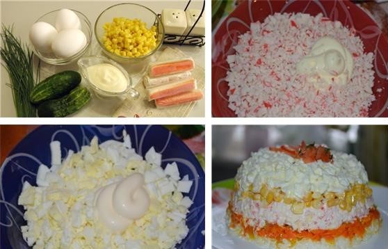 Готовят салат с крабовых палочек по классическому рецепту, и в приготовлении, хозяйки добавляют любимые овощи. Они придают блюду необычный мягкий вкус. Для разнообразия можно добавить в салат морковь и основные ингредиенты- рис, кукурузу, яйца, и крабовые палочки. Отварные и размельчённые ингредиенты уложить слоями. По вкусу присолить и пропитать майонезом. За ночь он настоится и станет нежным, приятным на вкус.