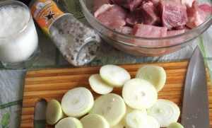 Берём несколько головок репчатого лука и очищаем их от шкурки. Потом лук нарезаем крупными кольцами или полукольцами, выкладываем их в миску с мясом.