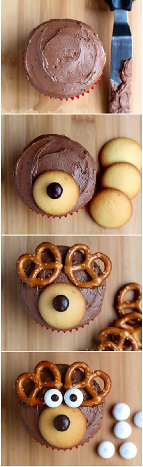 Для украшения берём шоколадную глазурь (или пасту Нутелла), печенья различной формы, а также шоколадное драже. Получается очень симпатично и весело!