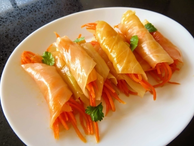 Полученную смесь выкладываем на капустные листочки и формируем из них рулетики/ конверты.