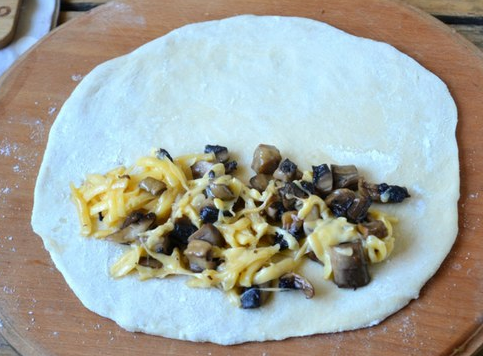 На раскатанный круг теста положить грибную начинку и посыпать сыром. Чебурек залепить и жарить в растительном масле.