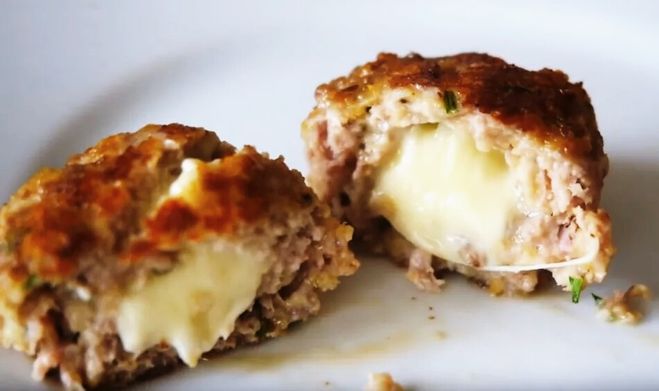 Далее, сыр. Один вариант - это разрезать его на кубики. Из фарша сформировать лепешку, вложить в него кубик сыра, и скатать мясной шарик так, чтобы сыр получился внутри. Так поступить со всеми.