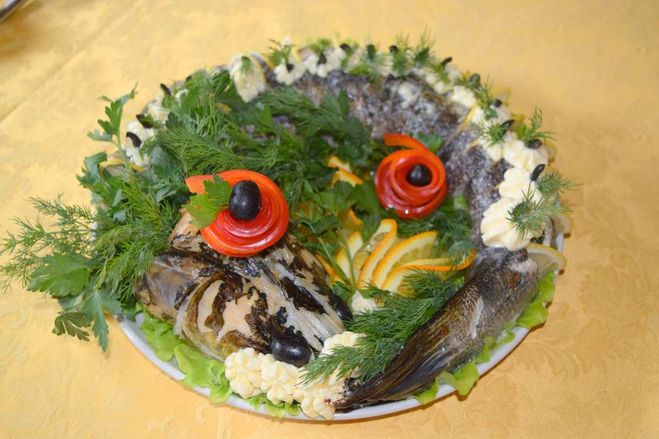 У готового судака удалить зубочистки (или нить) и уложив на блюдо, украсить креветками, свежими овощами и зеленью.