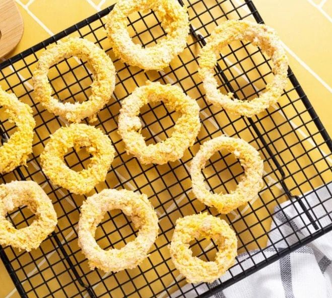 Если доедали колец пришлось отложить "на завтра", то хрусткость, вероятнее всего, пропадёт. Вернуть её можно, поместив кольца в горячую духовку или подогрев на сухой сковороде с антипригарным покрытием.