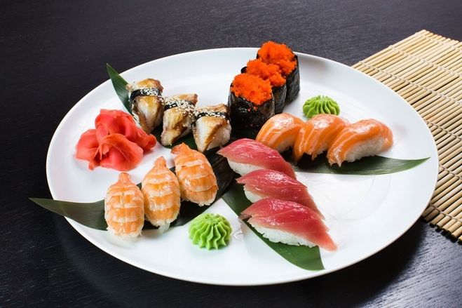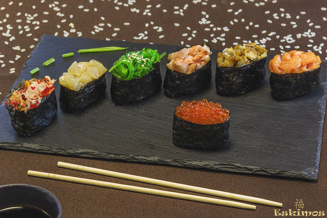 С икрой готовят суши-лодочки - гунканы. Они представляют собой комок риса, обмотанный нори и сверху наполненный икрой. Гунканы так же готовят с рыбой, креветками и угрем. Рыбу и морепродукты в гунканы мелко нарезают.
