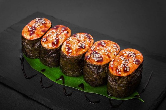 Гунканы часто готовят с шапочкой из острого соуса спайси, а так же их запекают на гриле.