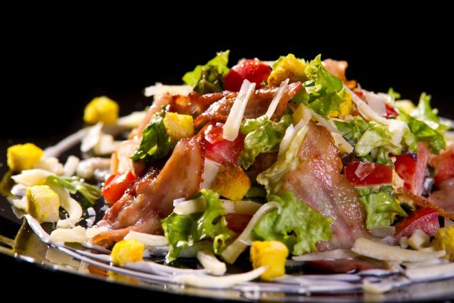 Я предложу следующий рецепт салата "Цезарь с беконом".