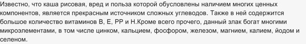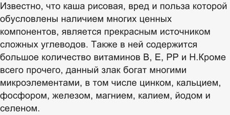 Калорийность рисовой каши зависит от следующих параметров: метод обработки рисовых зёрен; способ обработки (пропаривание,шлифовка); способ готовки и наличие добавок. Самый полезный рис тот, который минимально обрабатывали. В нём сохраняется наибольшее количество полезных веществ.