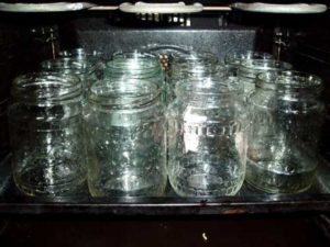 - Нагреваем духовку до 150 градусов и на чистым противне помещаем в духовку банки, они должны высохнуть в духовке. И таким образом банки простерилизованы, можно их использовать для закатки.