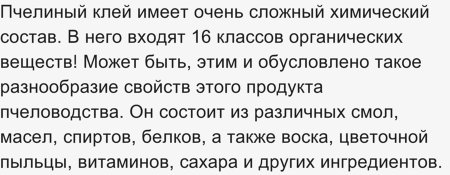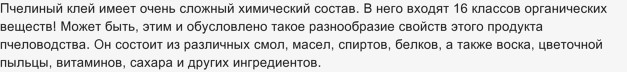 Перечислить все вещества, которые входят в клей пчёл сложно, да и названия всех этих спиртов, кислот, белков, и прочих "ингредиентов" прополиса мало что скажут не специалисту. Гораздо важнее другое - у человека нет органа, которому прополис не может оказать помощь. Поэтому его широко используют и в традиционной медицине, и в народной.