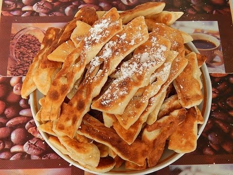 Жарить такой хворост лучше в духовке, разогретый до 180 градусов. Жарка длится не более 7-8 минут.Нужно следить, хворост должен зарумяниться, но не стать коричневым.