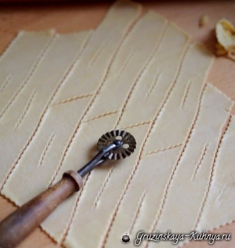 Дальше каждый раскатанный блин теста режем на полосы и формируем хворост.