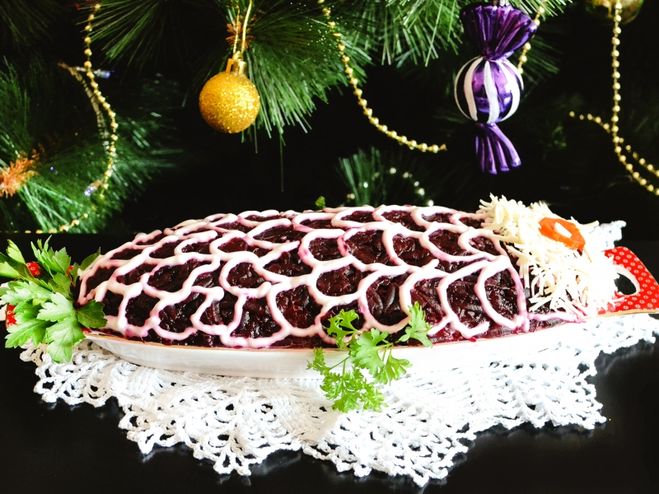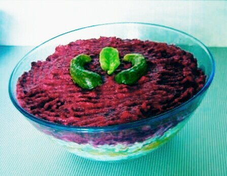 Шестой слой: свекла. Сверху можно ровным слоем смазать свеклу майонезом, а можно сделать решеточеу или какие-либо завитки. Смотреться будет интереснее.