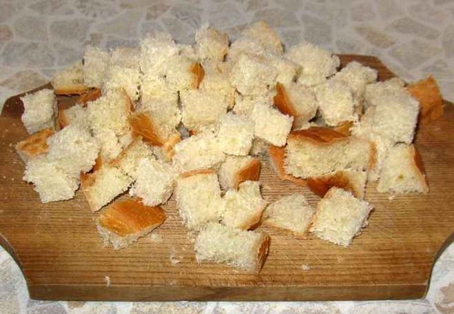 Приготовление сухариков для салата - дело несложное. Берем батон или белый хлеб, желательно, такие, которые уже пролежали один-два дня, поскольку слишком свежий хлеб резать проблематично. Режем заготовку на небольшие кубики.