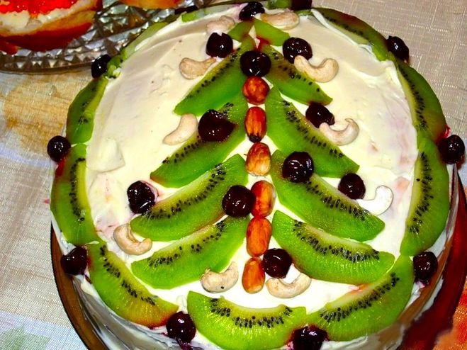 Ещё один отличный вариант украшения торта новогоднего, это использование свежих фруктов и орехов. Такой тортик можно приготовить для детишек.