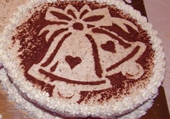 В этом варианте украшения торта достаточно сделать трафарет из картона и приготовить шоколадную стружку. Можно и обычное какао взять, в порошке.